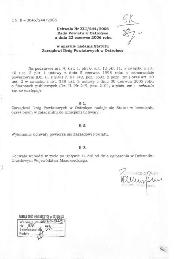 | Uchwa艂a Nr XLI/244/2006 Rady Powiatu w Ostro艂臋ce z dnia 22 czerwca 2006 roku |
