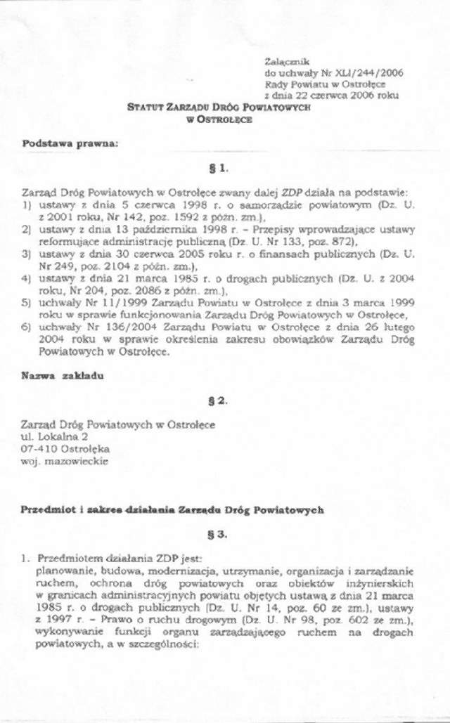 Statut Zarz膮du Dr贸g Powiatowych z dnia 22 czerwca 2006 roku